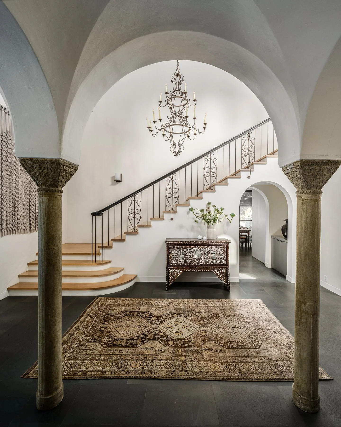 This project strikes a delicate balance of preserving historical charm and infusing contemporary functionality. We took inspiration from the architectural elements of the space, including the arched windows and doors, curved doorways and linear beams. The entry and living room are now chic, comfortable and inviting. We managed to create a harmonious historic space that feels like a modern home.