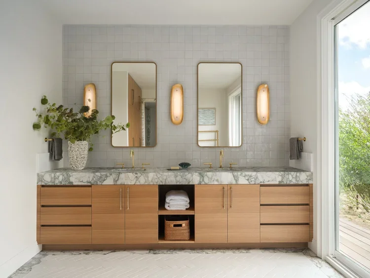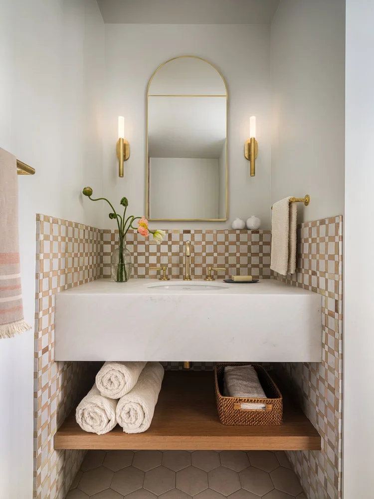 We transformed this ordinary grey bathroom into a bright and inviting space for guests. Handmade Zellige tile work, new lighting, and a custom vanity make it feel so polished, without losing its sense of home.