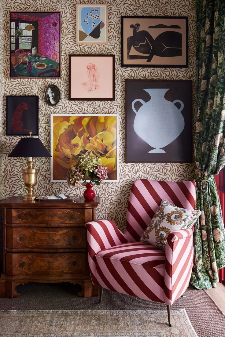I love this vibrant room inspired by Zelda Fitzgerald. The Morris & Co wallpaper and fun drapery, with the colorful gallery wall, and candy-striped upholstered chair work together to create a bold yet cohesive space full of visual interest and fun!