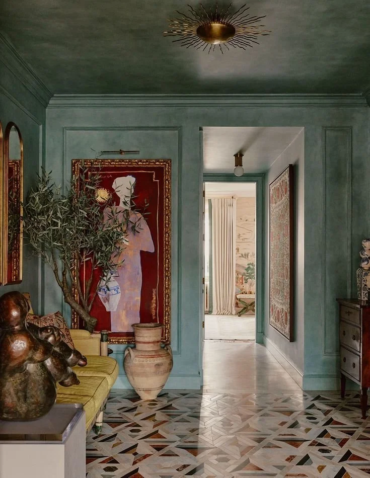 This apartment features a striking marble marquetry floor, a 19th-century French sofa upholstered in citrus colored silk, turquoise walls, and a sunburst ceiling fixture, all anchored by the homeowner’s extensive art collection. This vibrant design is a beautiful example of how a space can be tailored to reflect and elevate its inhabitant’s unique taste and style.